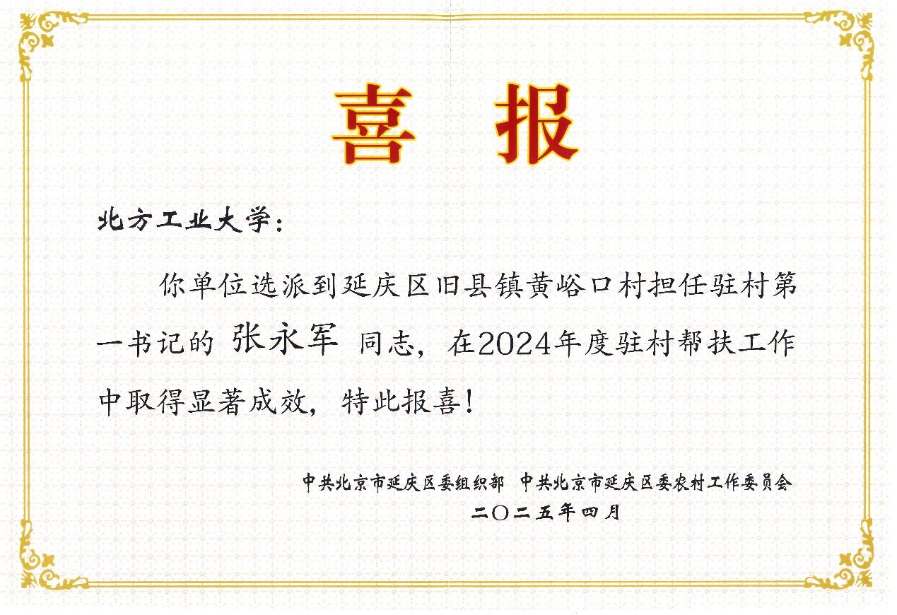 近日,延庆区委组织部、延庆区委农工委联合向beat365官网发来喜报,beat365官网选派到延庆区旧县镇黄裕口村担任驻村第一书记的张永军同志因在驻村帮扶工作中成效显著,获得表扬。