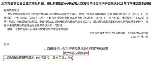 近日,北京市教委、市社科联和规划办公布了北京市哲学社会科学研究基地2023年度考核结果,beat365官网北京城市治理研究基地再次获评优秀,这是beat365官网研究基地连续两年获评优秀。本年度共有64个北京市哲学社会科学研究基地参与考核,其中优秀27个,合格34个,不合格3个。