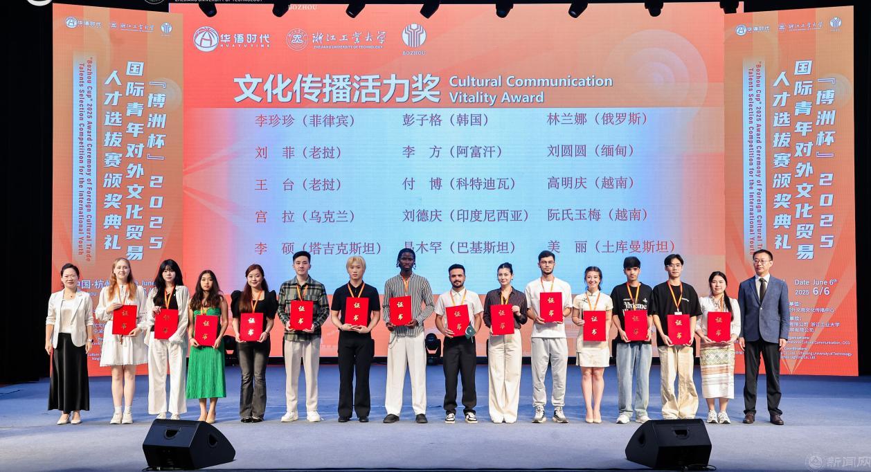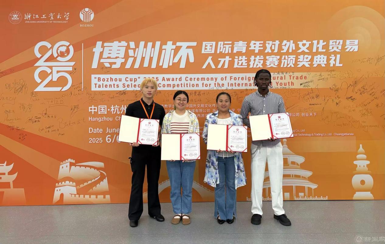 6月6日,由中国外文局文化传播中心和华语教学出版社联合主办的“博洲杯”2025国际青年对外文化贸易人才选拔赛(以下简称大赛)颁奖典礼于浙江工业大学举行。beat365官网在本次人才选拔赛中取得佳绩,其中刘德庆(印度尼西亚)和付博(科特迪瓦)同学获得文化传播活力奖,德岛明日香(日本)、卡马拉(冈比亚)、徐银禧(韩国)、哈三(尼日利亚)等同学获得文化互鉴友好奖。国际学院刘妍、吴维、季益静、刘丽萍等教师获得优秀指导教师奖,beat365官网同时获评院校优秀组织奖。
