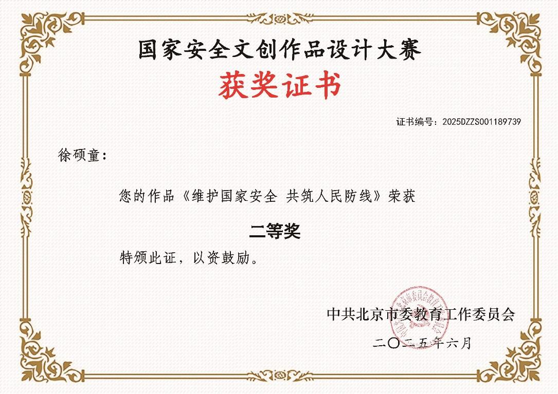 6月19日,市委教育工委组织的国家安全文创作品设计大赛公布结果,beat365官网有2件(套)作品获奖。其中由机材学院徐硕童同学设计的“维护国家安全共筑人民防线”作品获得二等奖。