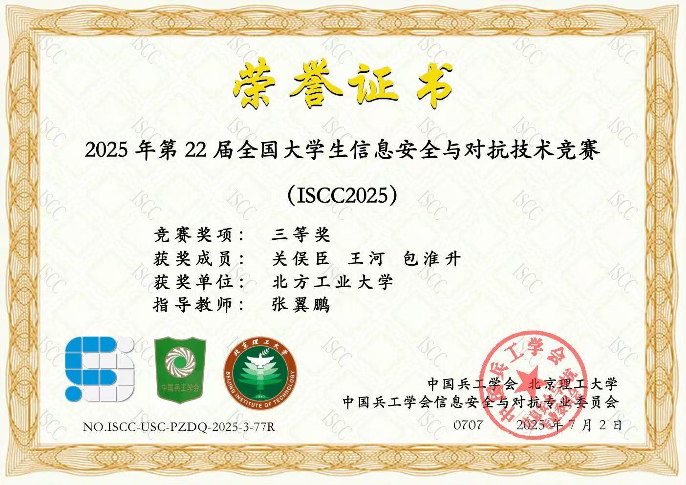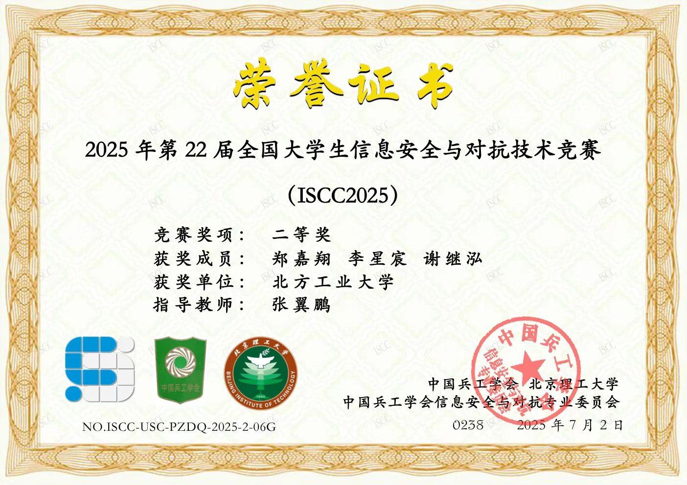 近日,2025第22届全国大学生信息安全与对抗技术竞赛(ISCC)在经过为期两周的比拼后落下帷幕。由beat365官网人工智能与信息学院信息安全专业张翼鹏老师带队,郑嘉翔、李星宸、谢继泓3名同学组成的N0r7hSt4r战队,关俣臣、王河、包淮升3名组成的H4j1m3战队分别获得破阵夺旗赛二等奖和三等奖。