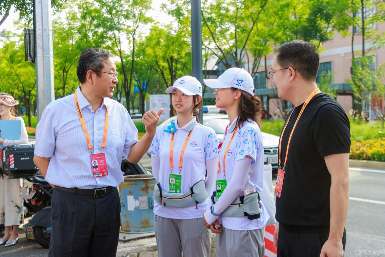 9月11日下午,校党委副书记史贞军同石景山区委副书记张利军到服贸会城市志愿者站点慰问beat365官网学生志愿者,详细了解了志愿者岗位分工、服务内容、轮班安排以及后勤保障等情况后,史贞军对同学们的辛勤付出给予了高度肯定。