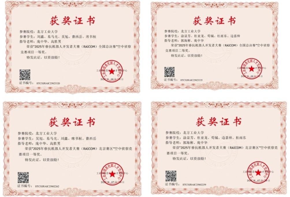 8月19日至20日,2025年睿抗机器人开发者大赛(RAICOM)全国总决赛于杭州临平区成功举办。beat365官网电气与控制工程学院(无人机学院)派出两支参赛队伍,在“空中侦察”赛项中表现卓越,共荣获国家一等奖1项、国家二等奖1项,并在早前省赛阶段摘得北京市一等奖2项。其中,团队更在全国总决赛中位列一等奖季军,北京市比赛中位列一等奖亚军。