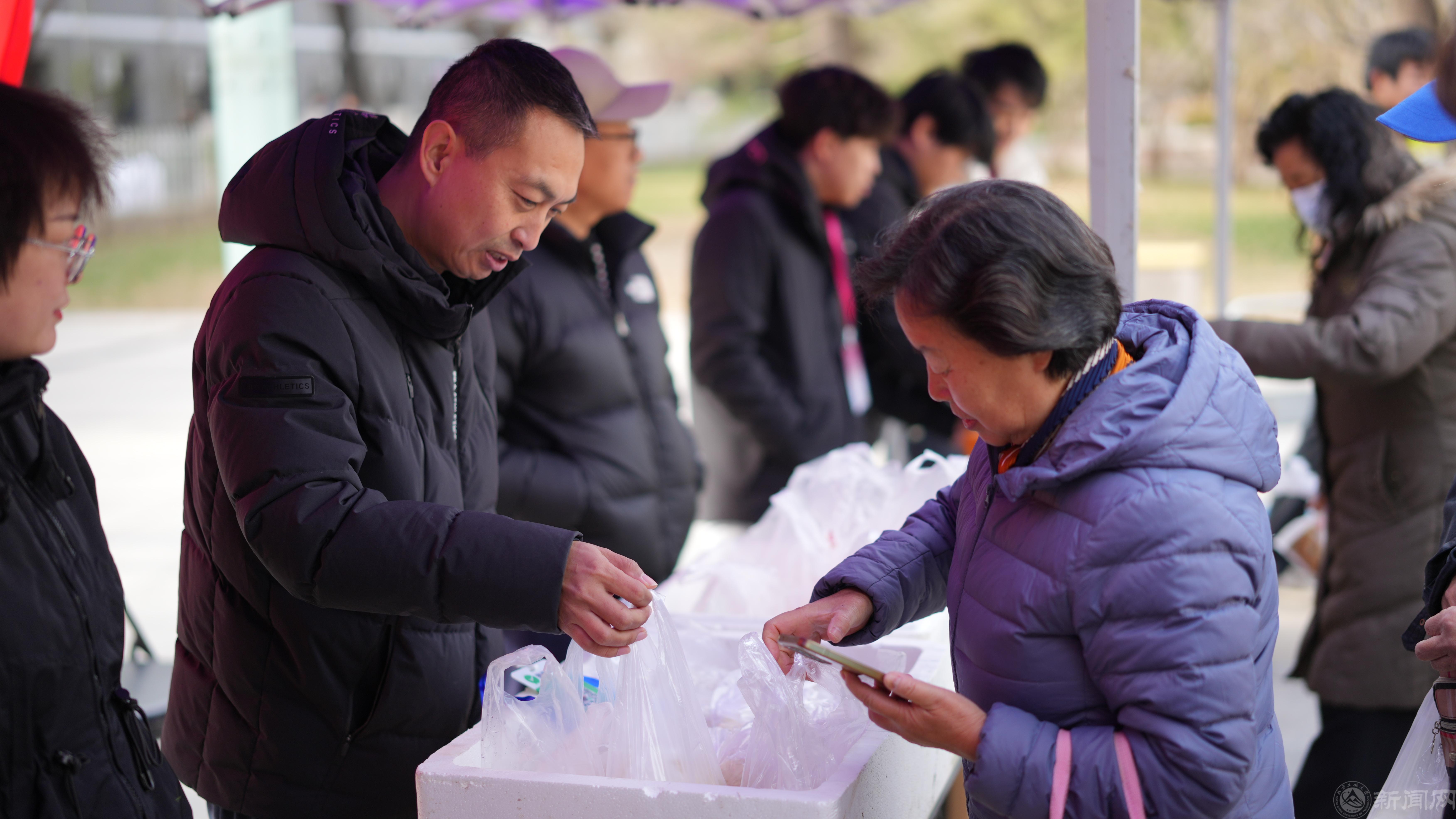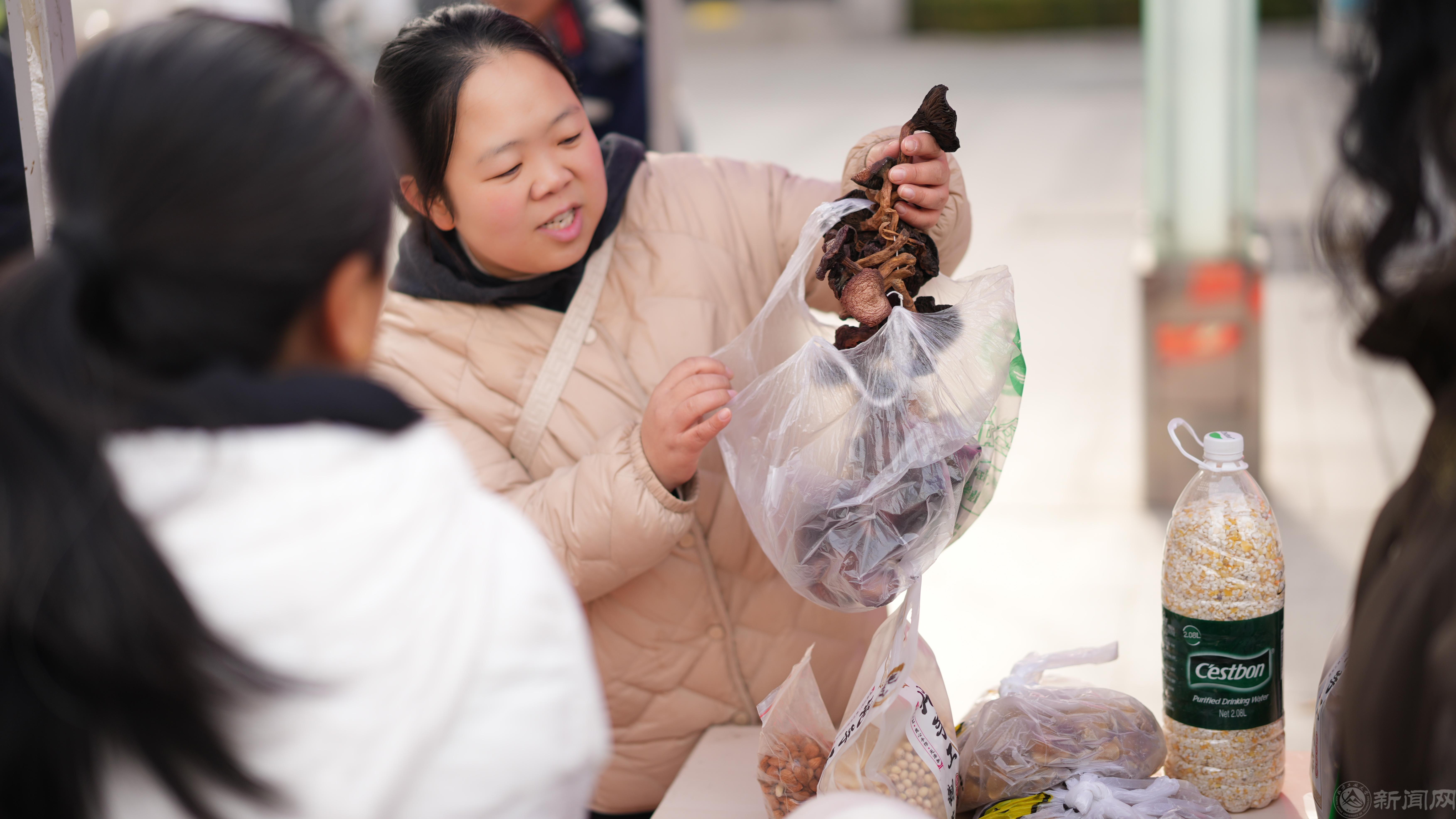活动现场,多个展区内人流络绎不绝。新鲜果蔬展区里,苹果、红薯等有机果蔬鲜灵欲滴;非遗手工艺品展区里,一件件手工艺品创意十足、工艺精细;在特色产品展区里,蜂蜜、杂粮、豆制品等农副产品供不应求。活动吸引了众多师生驻足选购,现场气氛热烈。