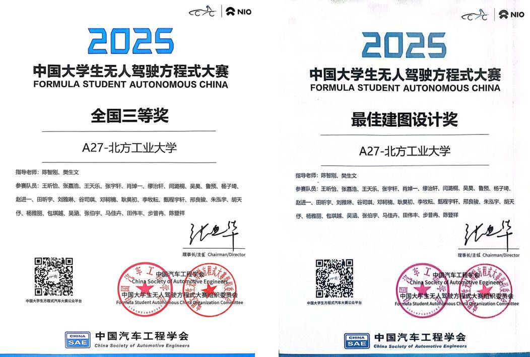 当2025“蔚来杯”的方格旗落下,北方工业大NRT车队的战绩,早已超越了奖项本身——它是队员们无数个日夜打磨赛车的坚守,是指导老师全程陪伴的匠心,更是学校“产教融合、实践育人”理念的鲜活落地。从E63电车在效率测试、耐久比赛中的稳定发挥,到A27无人车凭借精准建图斩获专项奖,每一项成绩背后,都是“理论+实践”的深度融合,是跨学科团队协同作战的成果。通过自主设计赛车、应对赛场突发状况,队员们不仅巩固了专业知识,更练就了直面挑战的勇气与解决复杂问题的能力,这正是高校培养适应产业需求人才的核心目标。