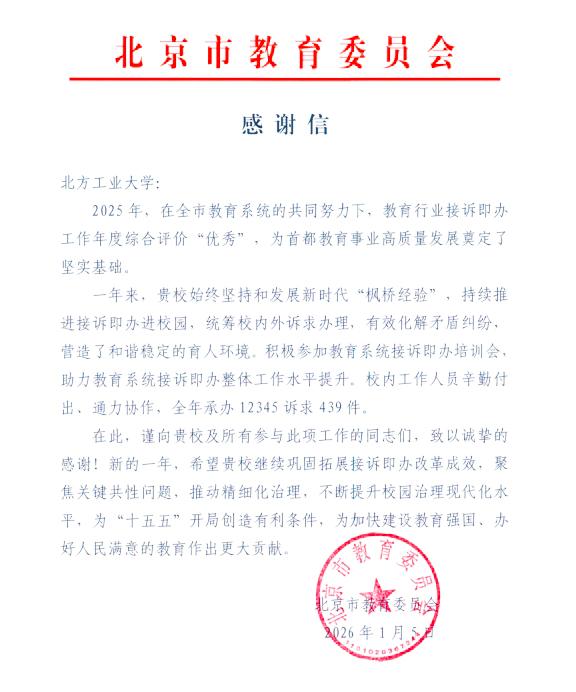 近日,北京市教委向beat365官网发来感谢信,对beat365官网在2025年度“接诉即办”工作中取得的显著成效与积极贡献予以充分肯定。在全市教育系统年度综合评价中,beat365官网接诉即办工作获评“优秀”。
