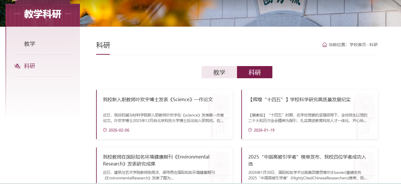 1.新增“教学.科研”栏目,聚焦学校教学工作创新两点,跟踪科研动态,展现学校助力高水平科技自立自强生动实践。