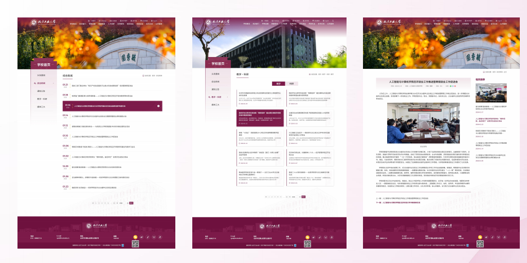 1.页面整体采用长滚式布局,分为8个全屏展示,以“工大紫”为主色调,体现学校“兴工报国”文化传统;以蓝色为辅色,突出工科院校的特征;融入校徽、辅助图形、点、线、校园建筑等元素,彰显北方工大特色。