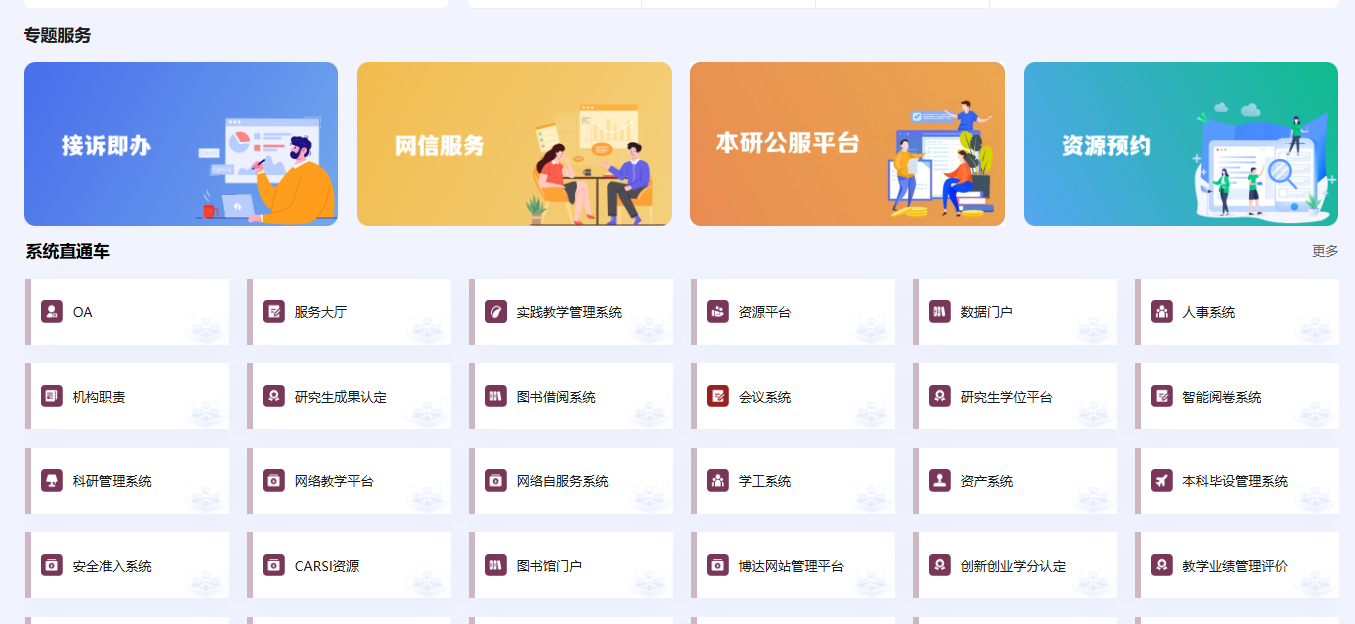 2.升级完善“一网通办”功能。强化“一站式”服务,“系统直通车”直通校内各个服务系统,高效办理网上业务。