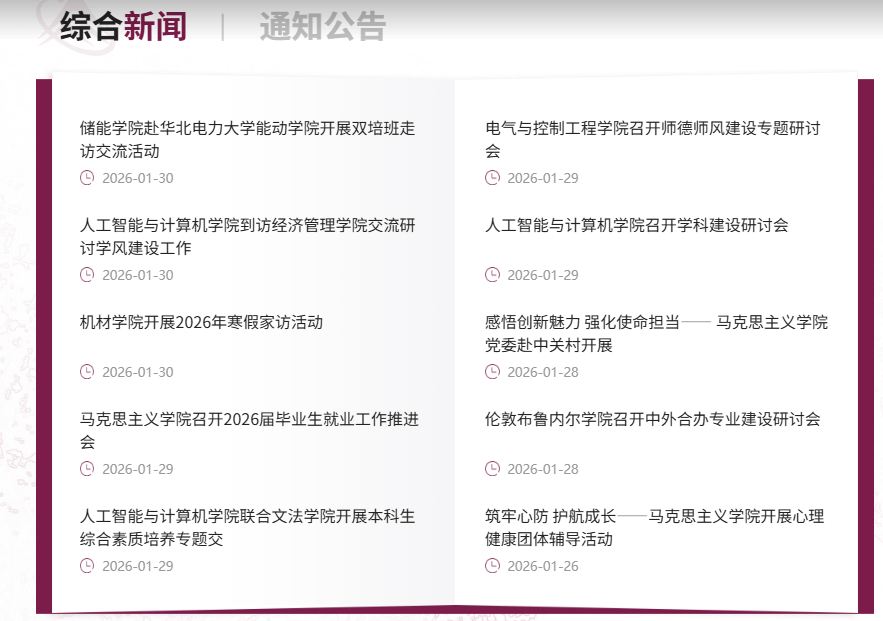 “学校要闻”采用新闻图片+新闻列表方式展示,“一主多辅”,突出新闻重点,兼顾信息全面性。