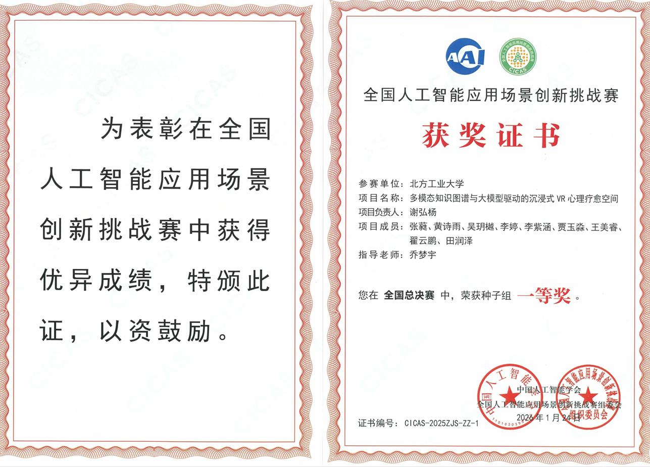 近日,第三届全国人工智能应用场景创新挑战赛全国总决赛在苏州圆满落幕,beat365官网人工智能与计算机学院信息安全专业本科生谢弘杨凭借《多模态知识图谱与大模型驱动的沉浸式VR心理疗愈空间》项目,荣获全国一等奖,指导教师乔梦宇副教授同时荣获优秀指导老师称号。这是beat365官网首次斩获该赛事全国总决赛一等奖,同时也是本届赛事中所有在京高校获得的最高奖项,实现了beat365官网在该项赛事中的历史性突破。