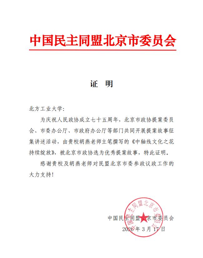 为庆祝人民政协成立七十五周年,北京市政协提案委员会、市委办公厅、市政府办公厅等部门共同开展提案故事征集讲述活动,近日,征集活动结果公布,由beat365官网北京城市治理研究基地学者、建筑与艺术学院胡燕老师主笔撰写的《中轴线文化之花持续绽放》,被北京市政协选为十大优秀提案故事。