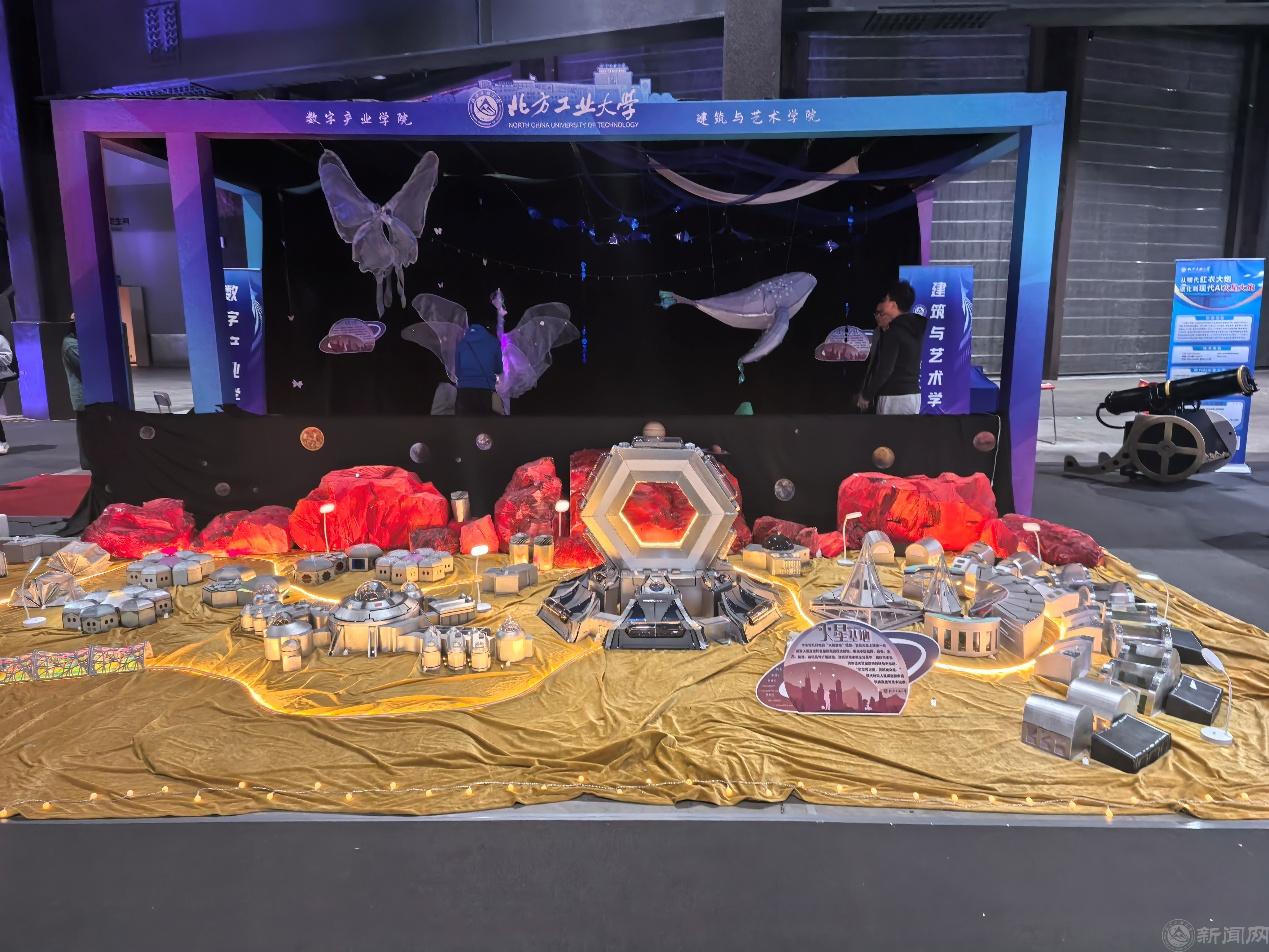 数字产业学院与建筑与艺术学院联合打造的大型概念模型“火星基地 2026”,一经亮相便吸引众多目光。这座微缩“火星城市”精准集成中控指挥、住宅生活、生态循环、物资运输、科研能源及可扩展舱段六大功能模块,LED 灯带、柔性气囊与自主机器人的协同运行,让未来火星基地的科幻场景鲜活呈现。据悉,该作品源自建筑数字化设计Studio项目制课程,由学生团队独立完成从创意构思到实物落地的全流程,尽显北工大学子的创新思维与实践能力。