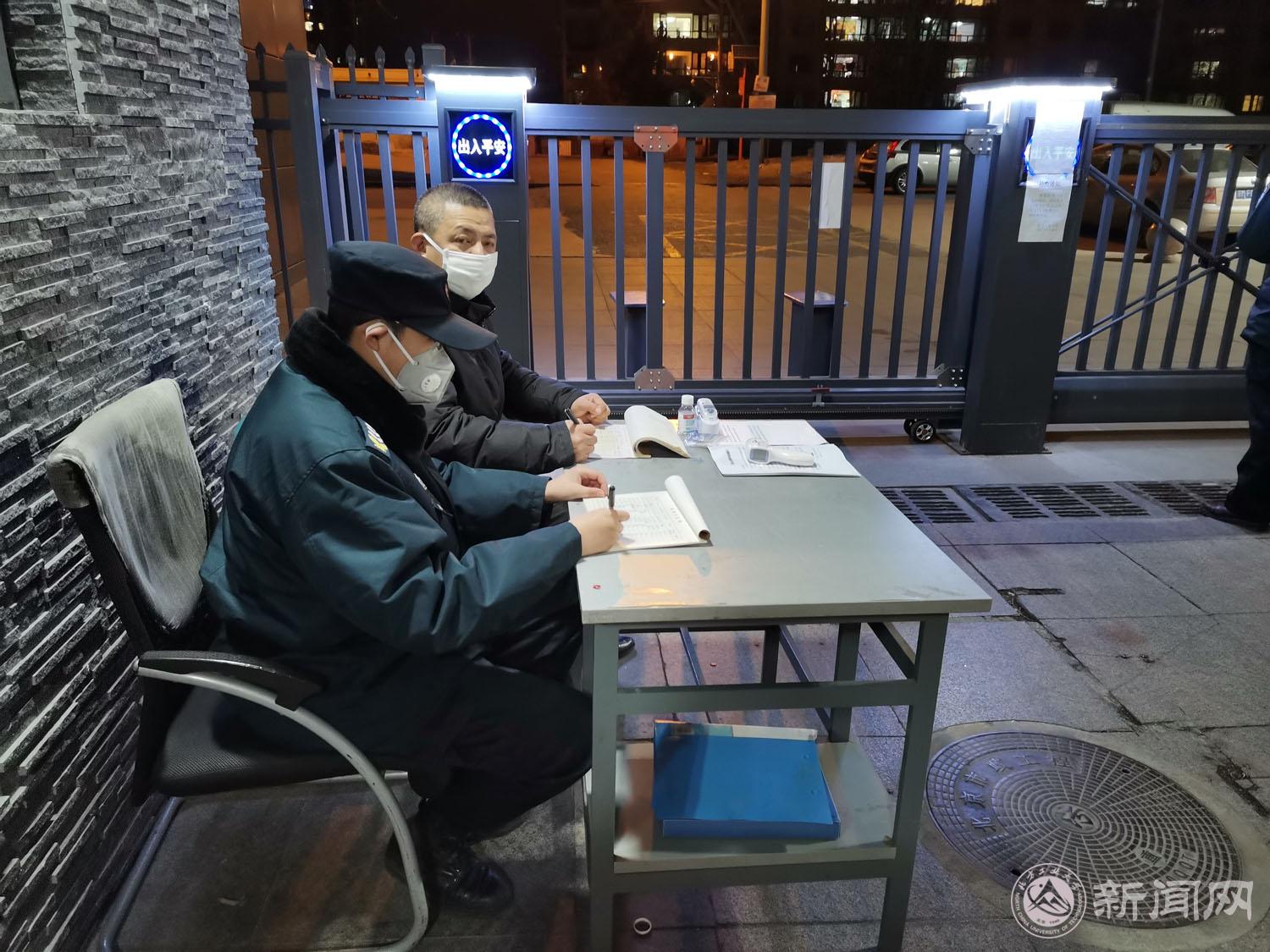 面对疫情,校警队中的党员和骨干冲锋在前。由于部分校警在疫情发生前请假返乡无法回校工作,人员不足成为掣肘。这个时候,老队员张元军、潘玉玺主动请缨到一线把守校门。对于此举,他们都觉得很平常。张元军说:“我来学校5年了,对各方面情况比较熟悉,认识的老师也多,到一线来更能发挥作用。”骨干队员每天从早7点工作到晚11点,一个班就是14个小时。目前,每天需要登记、检测的出入人员近400人次。校警队队长,老家在陕西三原的程永锋,来校工作已经12年,12个春节都是在岗位上度过的,他早已把学校当成自己的家。他说:“疫情就是命令,为家守好大门,这是我义不容辞的责任。”问及身在一线,队员们是否担心感染病毒。他说:“学校对校警队非常关心,书记、校长等校领导多次慰问我们,安稳处购买了防护用品,校工会送来了口罩,校医院拿来了消毒水,让队员们安心在岗位上做好工作。”