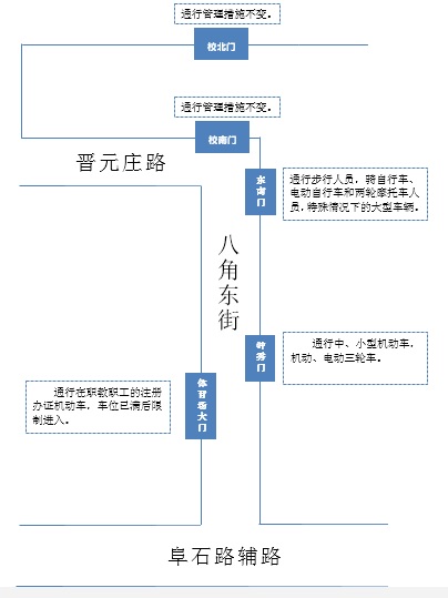 收费口只允许机动车通行(含小、中型机动车,机动、电动三轮车等);步行和骑自行车、电动自行车、两轮摩托车人员一律从校东南门通行。北门通行措施不变。