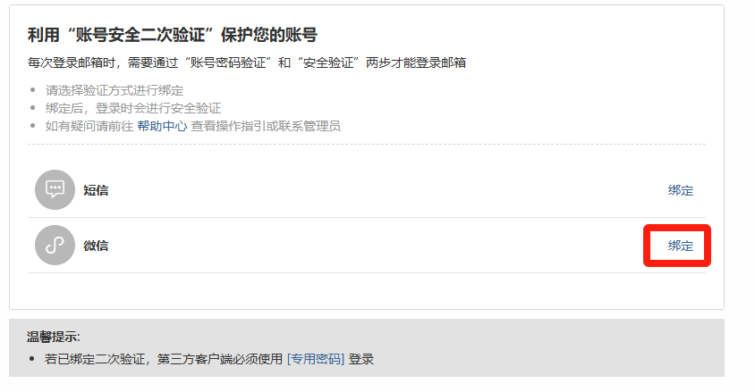 1.已绑定用户:通过企业微信、Foxmail、Outlook等第三方客户端需要重登录,登录必须使用【客户端专用密码】(与日常登录密码不同)。