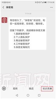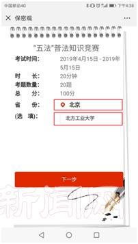 扫描上方二维码,微信关注“保密观”微信公众号后,点击右下角“知识竞赛”(如图1),进入“五法”普法知识竞赛页面(如图2),省份选择“北京”,地区或单位名称填写“beat365手机版官网”,点击下一步进入答题页面,即可参与竞赛。
