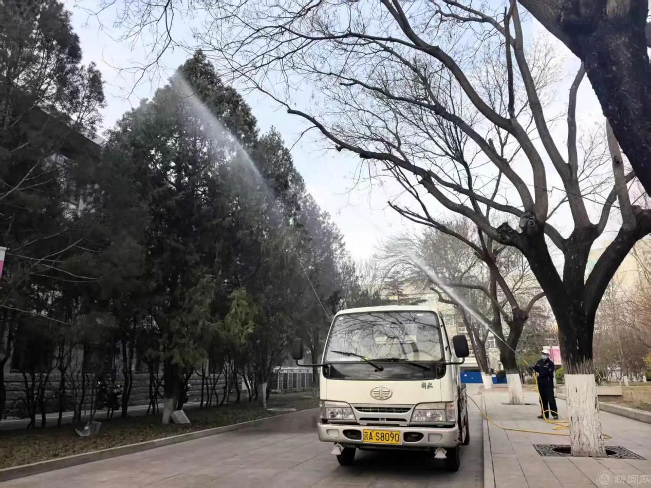 后勤部门组织绿化工每日派出洒水作业车,满载按比例稀释的溶液,对校园内圆柏进行立体式喷洒。绿化工克服树体高大、春季多风等困难,利用早上时间,避开师生出行与活动高峰,连续奋战6天,累计用水18车次,确保每株圆柏均达到成膜所需的喷洒频次与覆盖密度。目前,校内以往春季常见的“黄烟”飘散现象明显下降。