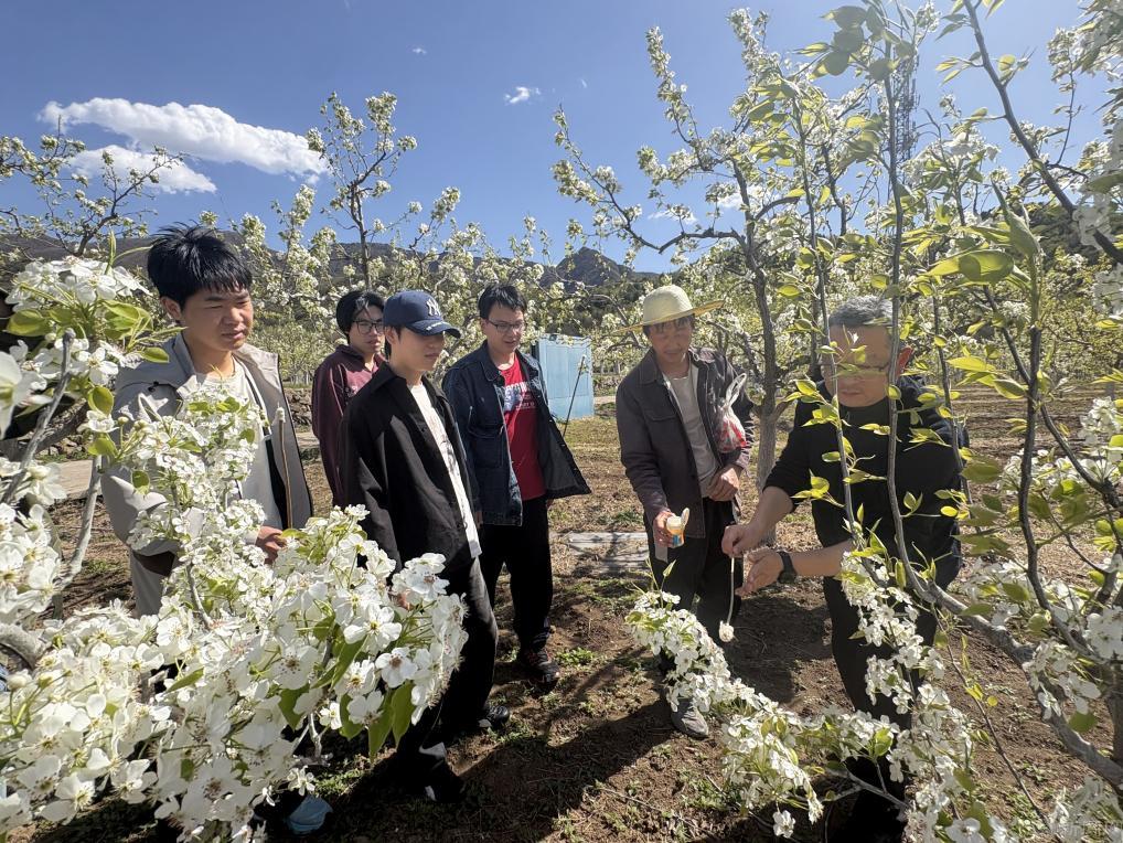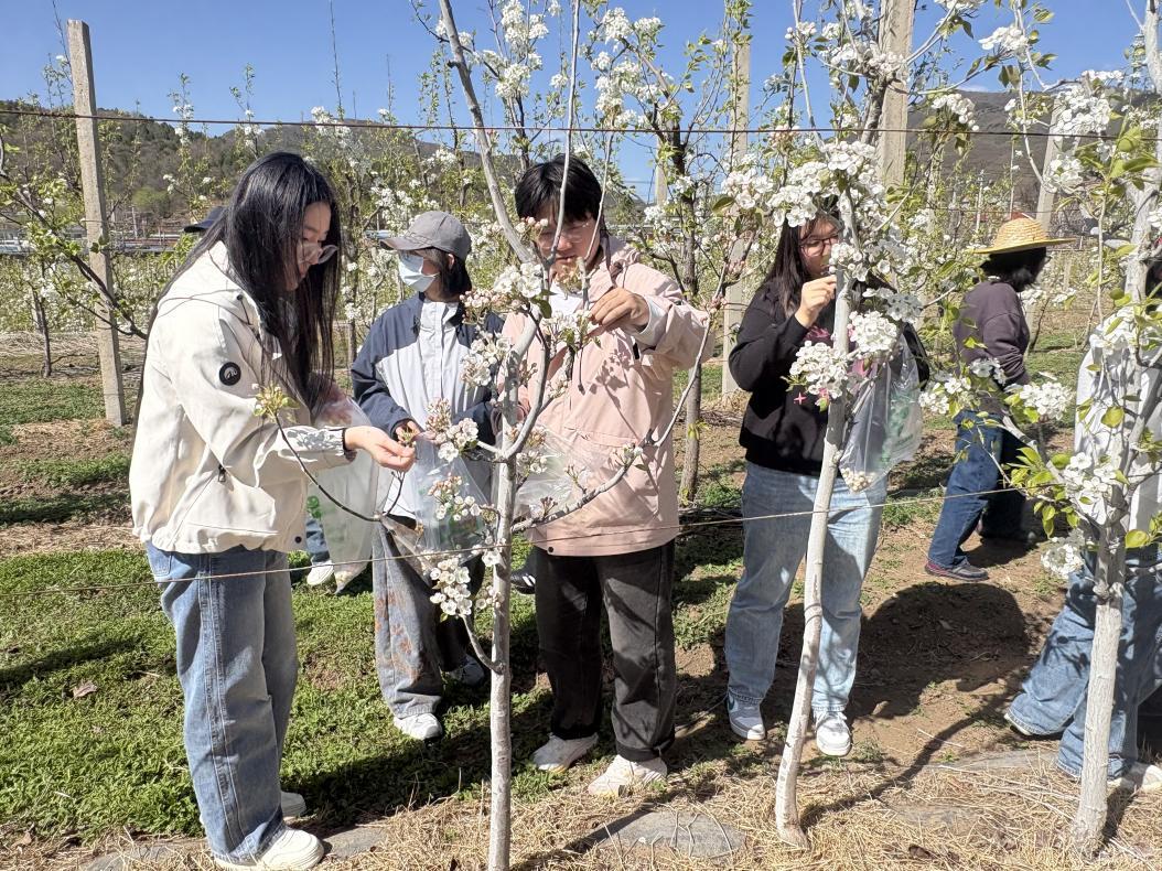 “京白梨异花授粉最根本的原因是它‘自交不亲’,同一品种的花粉落到自己的柱头上,无法正常受精,导致坐果率极低,所以需要搭配如‘鸭梨’等不同品种进行人工辅助授粉。”技术老师苏博士手持梨花,一边深入浅出地讲解着授粉的科学原理与操作要领,一边演示花朵采集和授粉操作的全过程。同学们围成一圈,专注聆听与学习。