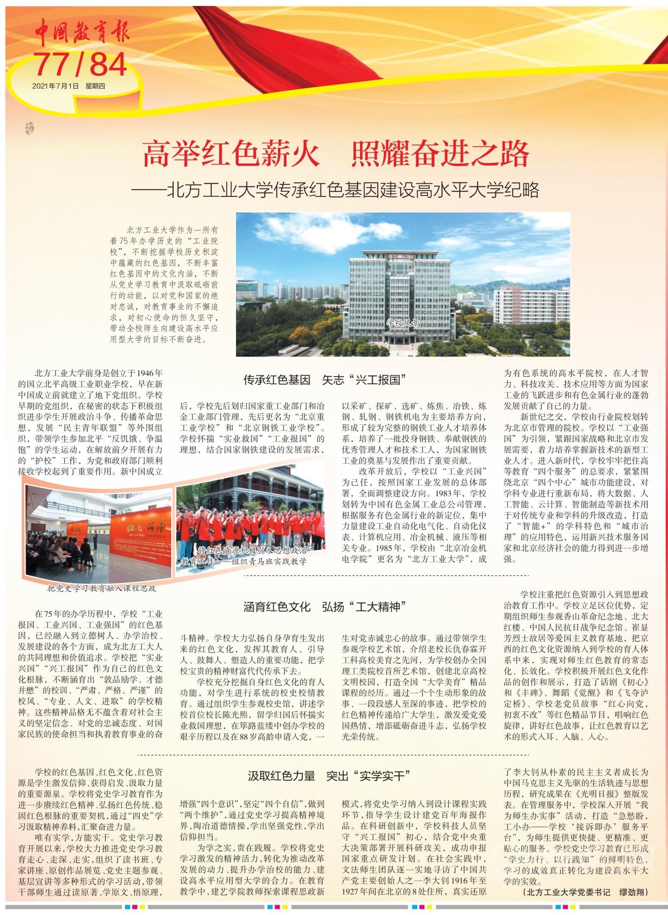 7月1日,在全国上下共庆中国共产党百年华诞之际,《中国教育报》“庆祝中国共产党成立100周年特刊·百年大计”以整版篇幅刊载beat365官网深入开展党史学习教育成效文章。