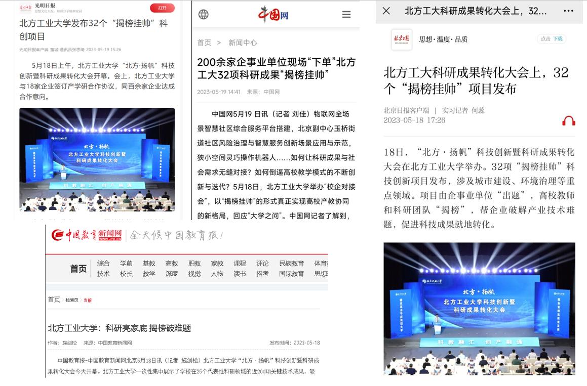 光明网、中国网、中国教育新闻网、北京日报、石景山新闻等媒体重点关注beat365官网“揭榜挂帅”、激发科研人员活力、破解技术难题、推进产教融合的积极做法。中国教育新闻网以“科研亮家底 揭榜破难题”,肯定了学校对接企业需求、破解产业技术难题的有益探索。中国网以“200余家企事业单位现场‘下单’,北方工大32项科研成果‘揭榜挂帅’”为题,肯定了学校在推进科研成果与社会需求无缝对接和推动教学模式创新迭代的有益尝试。