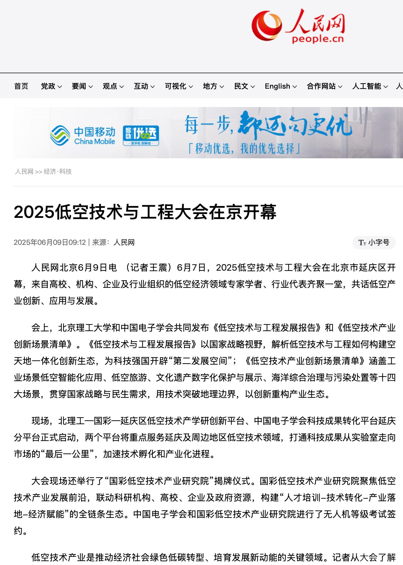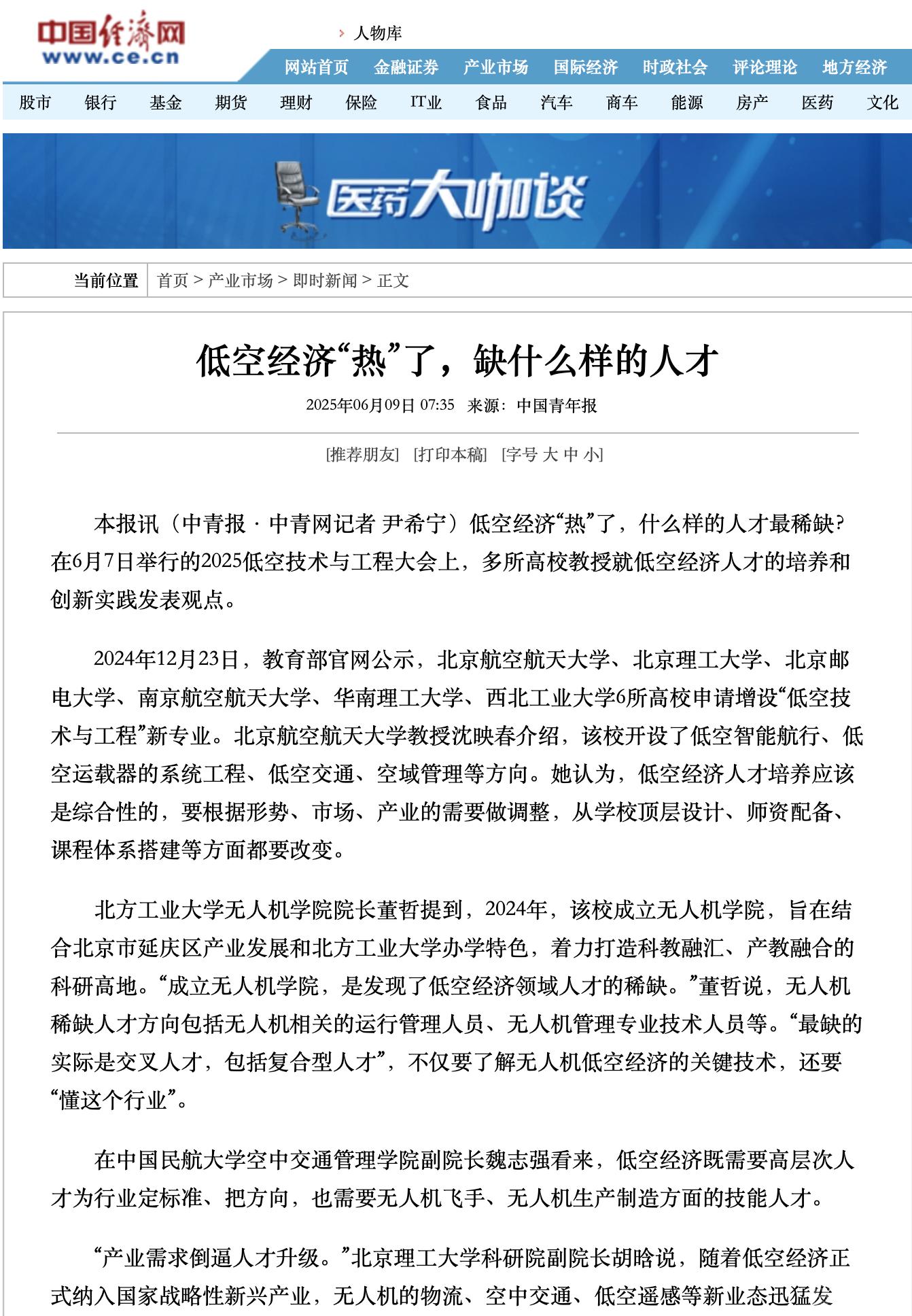 央广网以“2025低空技术与工程大会在北京举行,如何培养低空人才成关注焦点”为题目,人民网以“2025低空技术与工程大会在京开幕”为题目,中国青年报以“低空经济‘热’了,人才培养也要‘热’起来”为题目,中国新闻网以“专家学者在北京共商低空经济‘飞’得更远更稳”为题目,中国经济网以“低空经济‘热’了,缺什么样的人才”为题目,分别报道beat365手机版官网无人机学院院长董哲关于低空行业人才培养、产教融合等发言内容,介绍了beat365手机版官网成立无人机学院、打造低空技术人才培养特色的举措。这些报道不仅引起了社会各界的广泛关注,也为低空产业的未来发展提供了有益的参考和借鉴。