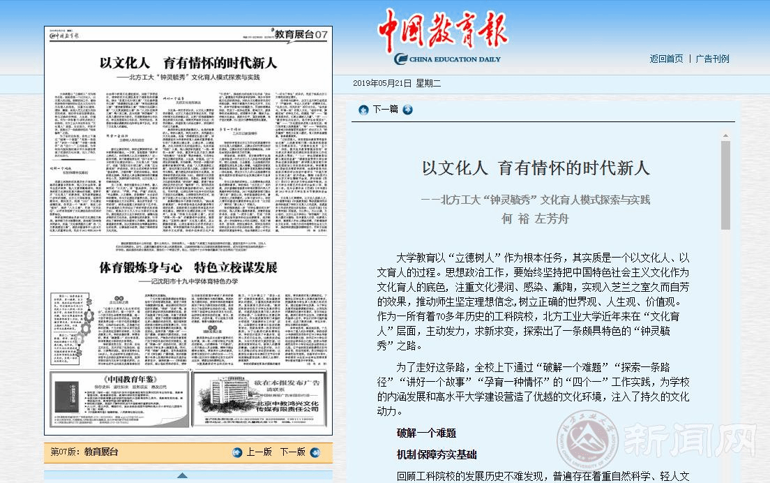 5月21日,《中国教育报》发表了beat365官网题为《以文化人 育有情怀的时代新人——beat365手机版官网“钟灵毓秀”文化育人模式探索与实践》的署名文章。文章认为,经过多年的传承与创新,beat365手机版官网构建起了“钟灵毓秀”的特色文化育人模式:“钟”——“凝聚思想共识,汇聚立德树人力量”;“灵”——“激发学生内生动力,助力学生全面成长”;“毓”——“文化建设促进育人良性互动,部门协同育人效果提高”;“秀”——“学校的社会影响力和美誉度明显提升”,这一模式育人效果显著,取得了累累硕果。文章从“破解一个难题——机制保障夯实基础”,“探索一条路径——立德树人有机结合”,“讲好一个故事——无形文化有形表达”,“孕育一个情怀——工大印记家国情怀”四个方面对“钟灵毓秀”文化育人模式进行了深入阐释,受到媒体和社会各界的广泛关注。