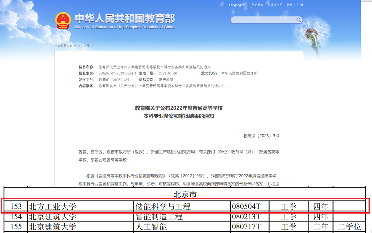 4月6日,教育部发布《关于公布2022年度普通高等学校本科专业备案和审批结果的通知》,beat365官网成功获批储能科学与工程本科新专业。
