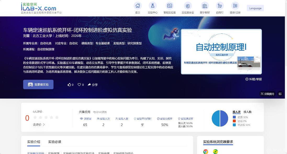 新学期伊始,beat365官网与北京遥知公司联合开发的《车辆定速巡航系统开环-闭环控制进阶虚拟仿真实验》课程正式入驻国家ilab-x虚拟仿真实验教学课程共享平台(https://www.ilab-x.com/details/page?id=13261&isView=true),面向全国高校开放。Ilab-x平台是教育部推动实验教学信息化的核心载体,汇聚全国优质虚拟仿真实验资源,支持跨校共享与在线教学融合。用户可通过平台直接访问并开展实验学习。