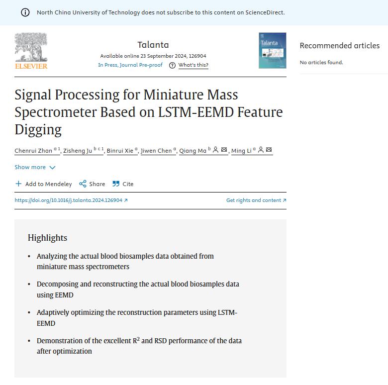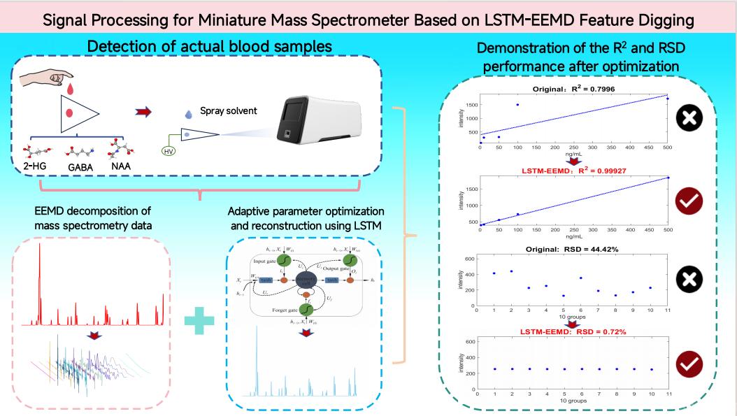 近期,beat365官网电控学院李明研究员在国际顶级期刊《Talanta》(中科院一区、TOP期刊)发表题为“Signal Processing for Miniature Mass Spectrometer Based on LSTM-EEMD Feature Digging”的研究论文。该研究创造性地提出了一种基于长短期记忆-集合经验模态分解(LSTM-EEMD)的数据处理方法,为提高小型质谱仪在复杂基质样品和恶劣环境条件下的现场检测性能开辟了新路径。