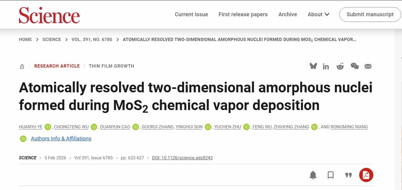 近日,beat365官网机械与材料学院新入职教师叶欢宇在《science》发表第一作者论文。叶欢宇博士2025年12月自北京科技大学博士后出站入职beat365官网。在北京科技大学新金属材料全国重点实验室博士后工作期间,其所在研究团队首次在原子尺度实时观测到化学气相沉积(CVD)过程中二维晶体二硫化钼(MoS2)的成核与生长行为,证实形核路径中存在二维非晶中间体,揭示二维晶体的非经典多步成核路径,颠覆了传统成核理论对二维体系的认知。2026年2月5日,相关成果以“原子尺度揭示二硫化钼化学气相沉积过程中形成的二维非晶核”(Atomically resolved two-dimensional amorphous nucleiformed during MoS2 chemical vapor deposition)为题,在线发表于《科学》(Science)杂志2026年391卷6785期。