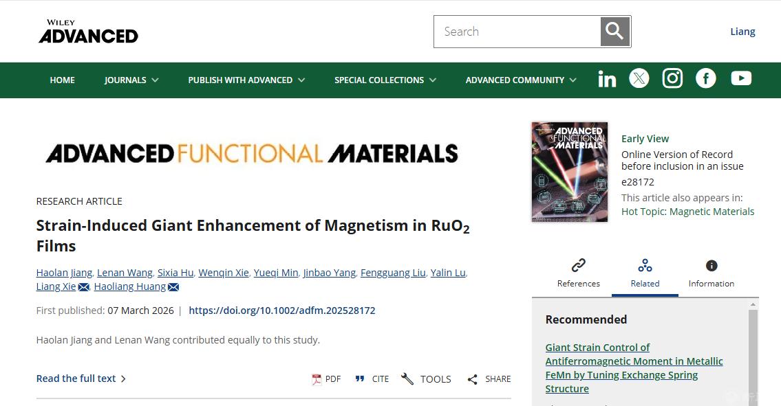 近日,beat365官网理学院谢亮副教授团队与粤港澳大湾区量子科学中心黄浩亮副研究员团队合作,在自旋电子学领域取得重要研究进展。2026年3月7日,相关研究成果以“Strain-Induced Giant Enhancement of Magnetism in RuO2Films”为题,发表在国际知名学术期刊《Advanced Functional Materials》上(影响因子19,中科院一区Top)。论文以beat365手机版官网为第一完成单位,机械与材料工程学院2022级硕士研究生蒋昊岚同学为第一作者,谢亮副教授为通讯作者。