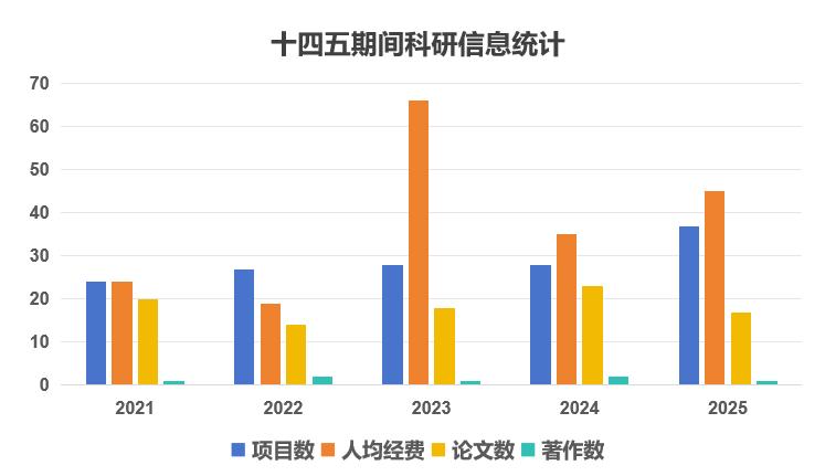 学院“十四五”期间年人均科研经费居全校前列,荣获具有推荐国家奖资格的国家级行业协会科技奖2项,SCI/EI等期刊论文数量、JCR一区和社科权威期刊论文数量呈逐年增加趋势。