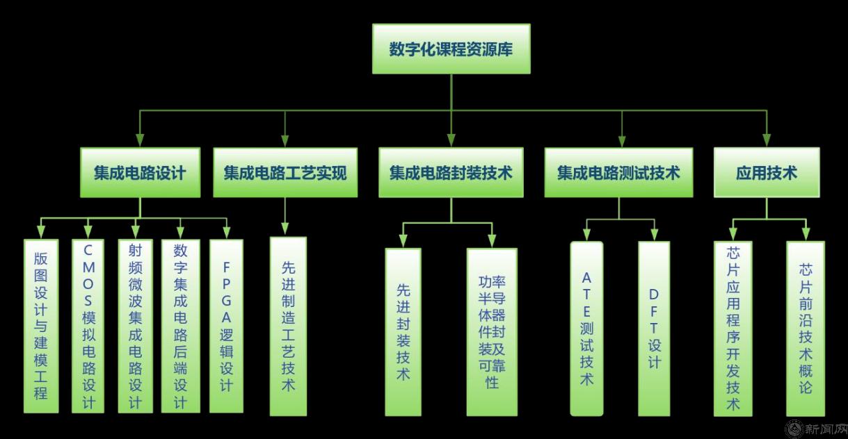 课程建设方面,结合产研需求,强化数智赋能。学院建立集成电路设计、芯片制造、封装及测试全产业链课程体系,分设 4 个课程群,每个课程群建立对应的实习实训基地。集成电路测试作为特色课程群,具有国内最完备的集成电路测试课程体系。将专业课程划分为校内课程、校企共建课程、企业课程3 类,联合头部企业,荟聚全国集成电路企业、科研院所及高校的优质师资力量,联合开发全产业链的数智化课程资源库,涵盖近 800 学时、20 余门专业在线课程,尤其是基于真实集成电路生产线环境开展浸润式实景、实操、实地教学模式。课程内容紧扣标准国家职业技术标准,内容涵盖初级、中级和高级3个层次,适用于不同阶段的学生和工程师,通过课程考核后可获得工信部认证的职业能力证书并纳入国家人才库。