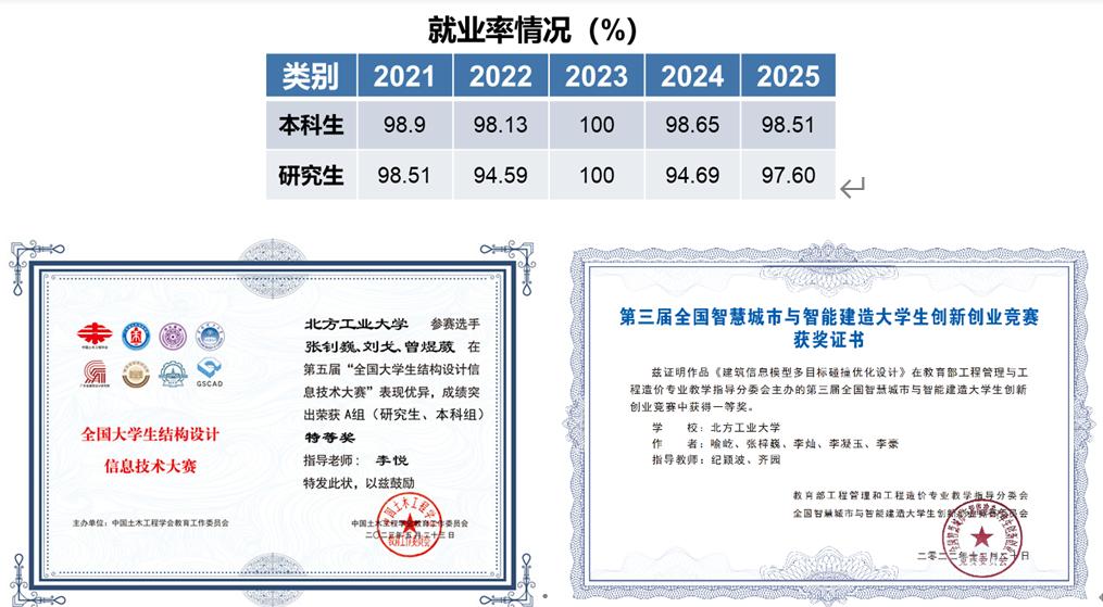 专业建设及转型发展成效显著。对标国家重大战略和行业转型升级需求,对传统土木类专业进行智能化、信息化升级改造。新增1个国家级一流专业建设点(工程管理)、2个北京市一流专业建设点(智能建造、土木工程),工程管理专业2021年通过住建部专业评估认证并于2025年通过复评。新设置的智能建造专业已顺利培养3届毕业生,实践教学水平走在全国前列;依托地空专业新申报了“智慧应急”专业;设置了“韧性城市安全与风险防控”和“建筑节能与低碳设计”(与数字产业学院共建)两个微专业。