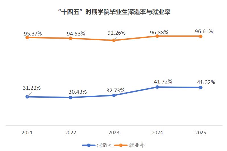 深造就业质量提升。毕业生深造率从2021年31.22%升至2025年41.32%;就业率保持高位,人才竞争力获社会认可。