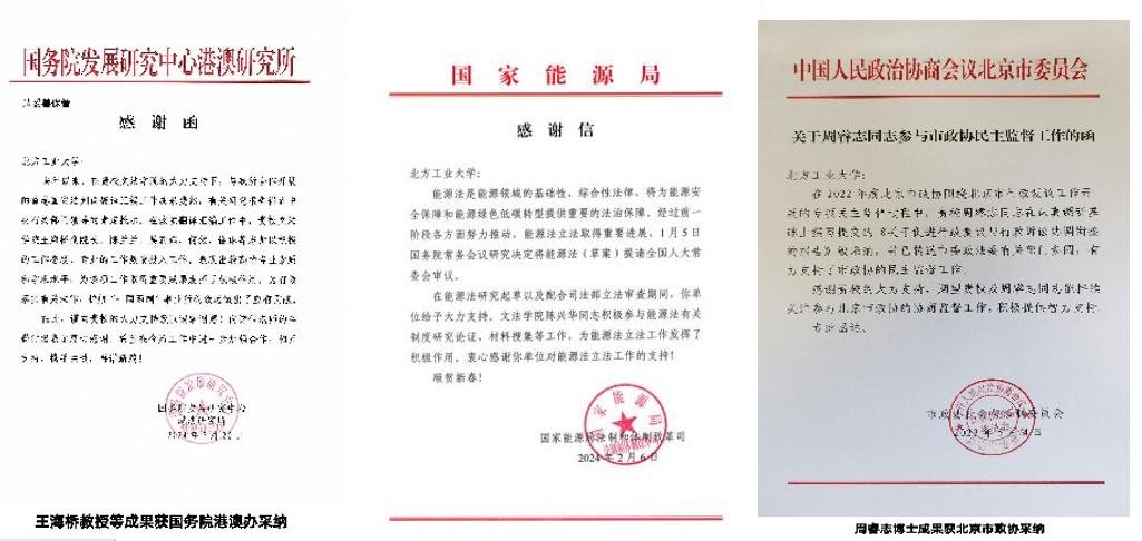 智库成果获高层次采纳。完成16项省部级以上社会服务成果。1名教师连续三次受聘中央依法治国办法治政府建设督察专家,1份研究报告获北京市委书记批示,多篇咨政报告被国家部委、北京市机关采纳,教师参与多项国家及地方立法论证。