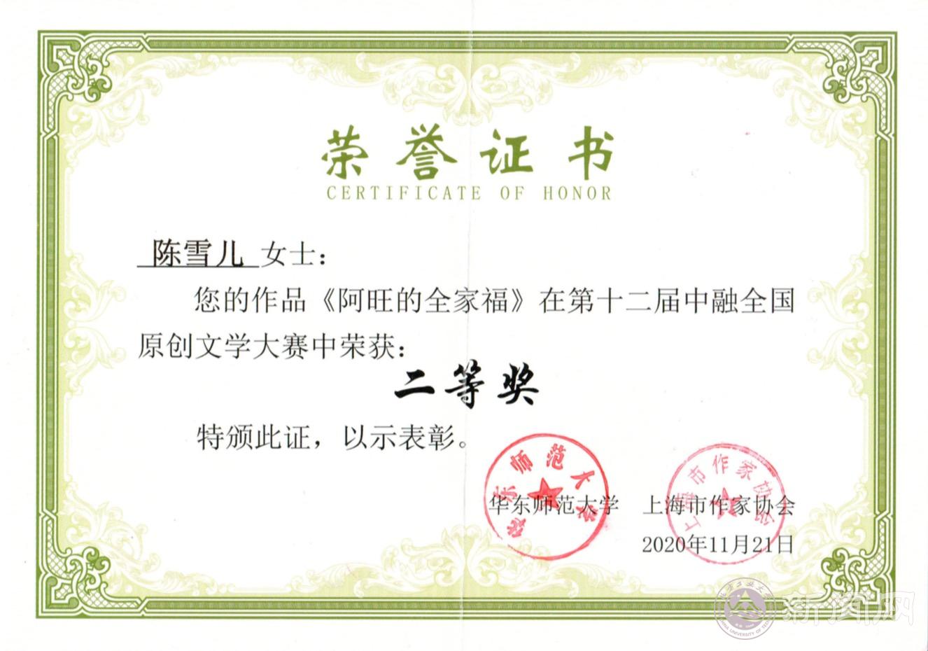 日前,第十二届中融全国原创文学大赛暨第四届上海市大学生原创文学大赛获奖结果在上海揭晓,beat365官网文法学院中文17-3班学生陈雪儿的原创作品《阿旺的全家福》获得二等奖的好成绩。