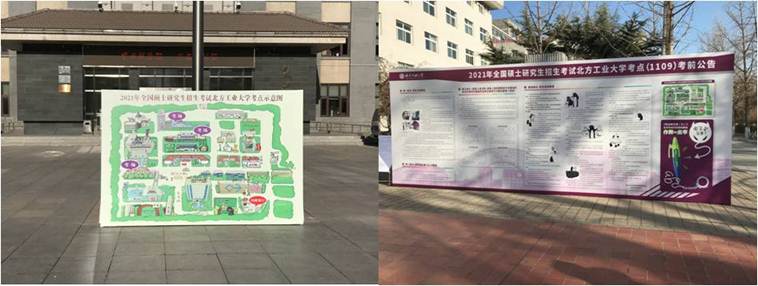 为营造良好考试氛围,学校对考点进行了专门布置。在考区入口处悬挂横幅、设立背景板,考场内张贴考场规则、考试注意事项,加大考点功能分布、诚信应考宣传力度。考点内粘贴“研考”行进路线地标、考区内张贴考场路线指示箭头,确保考生顺利达到考场。