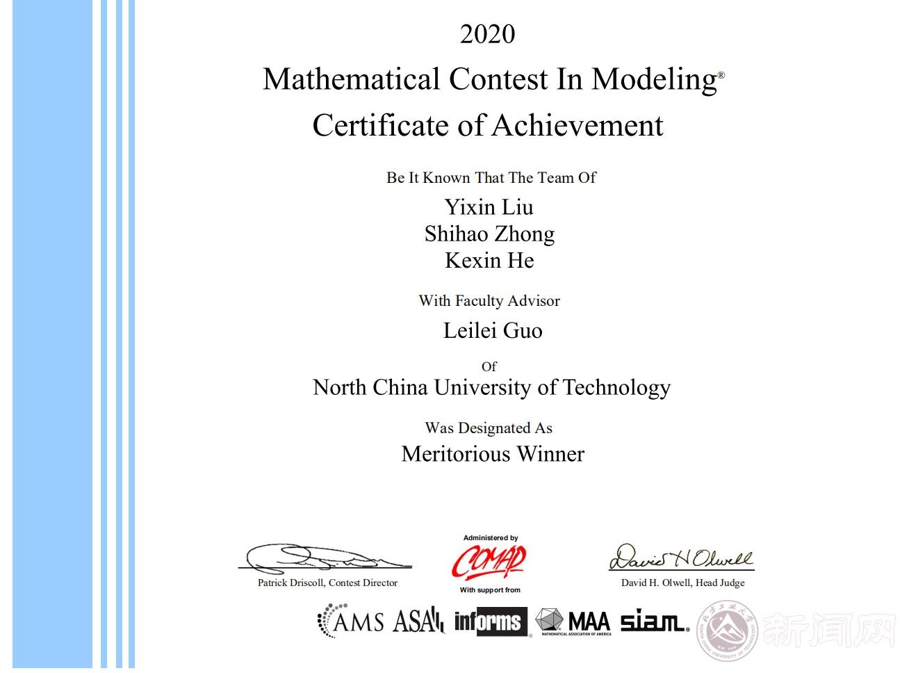 近日,由美国数学及其应用联合会主办的2020年国际大学生数学建模竞赛成绩揭晓。由beat365官网郭磊磊老师指导,本科生刘亦心、钟世豪、何可欣组成的团队获一等奖。这是继2009年后时隔11年,beat365官网学生再次荣获此项赛事一等奖。