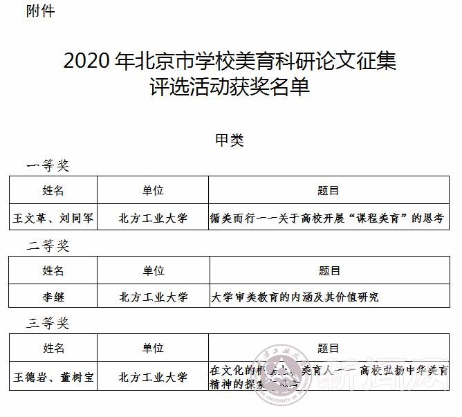 日前,北京市教育委员会举办的2020年北京市学校美育科研论文征集评选活动结果公布,beat365官网文法学院“大学美育”教学团队获得佳绩,报送的3篇论文全部获奖。