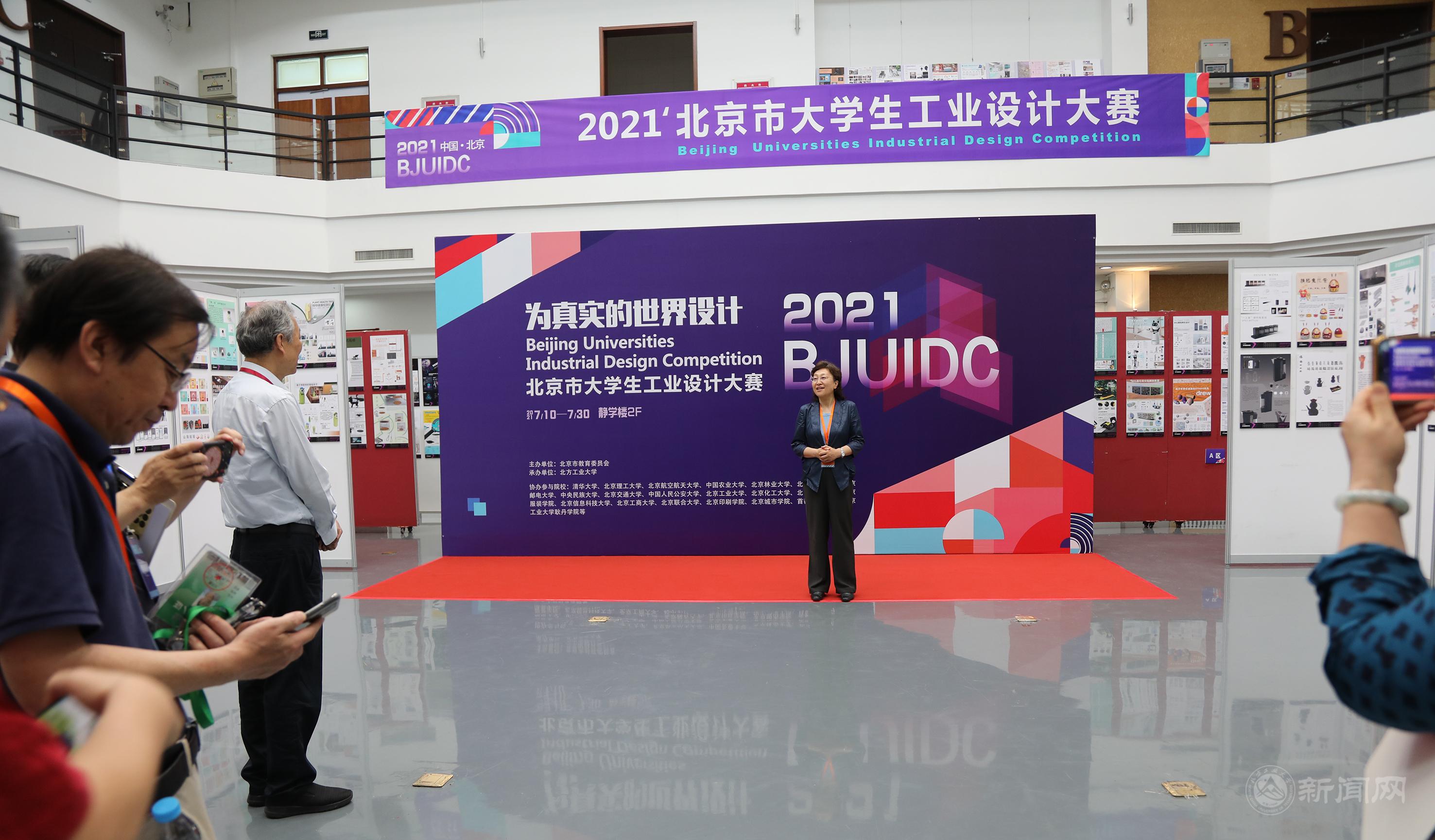 7月10日,2021北京市大学生工业设计大赛评审和开幕展览在beat365官网静学楼二层隆重举行。校党委常委、副校长栗苹,民盟中央文化委员会副主任、北京市政协副秘书长宋慰祖,教务处主要负责人、机械与材料工程学院班子成员和在京高校及设计企业等十四位业内专家评委出席展览开幕和评审活动。