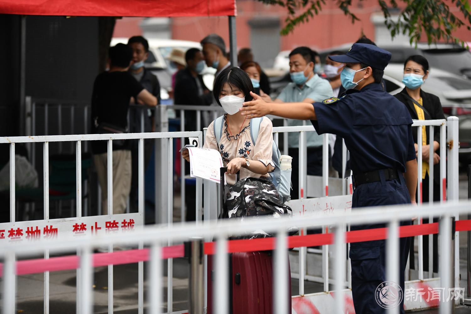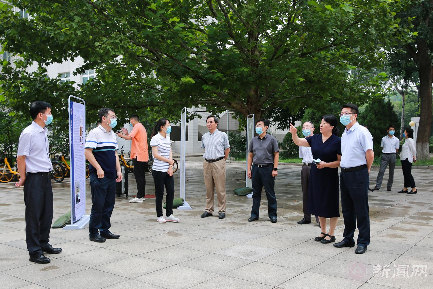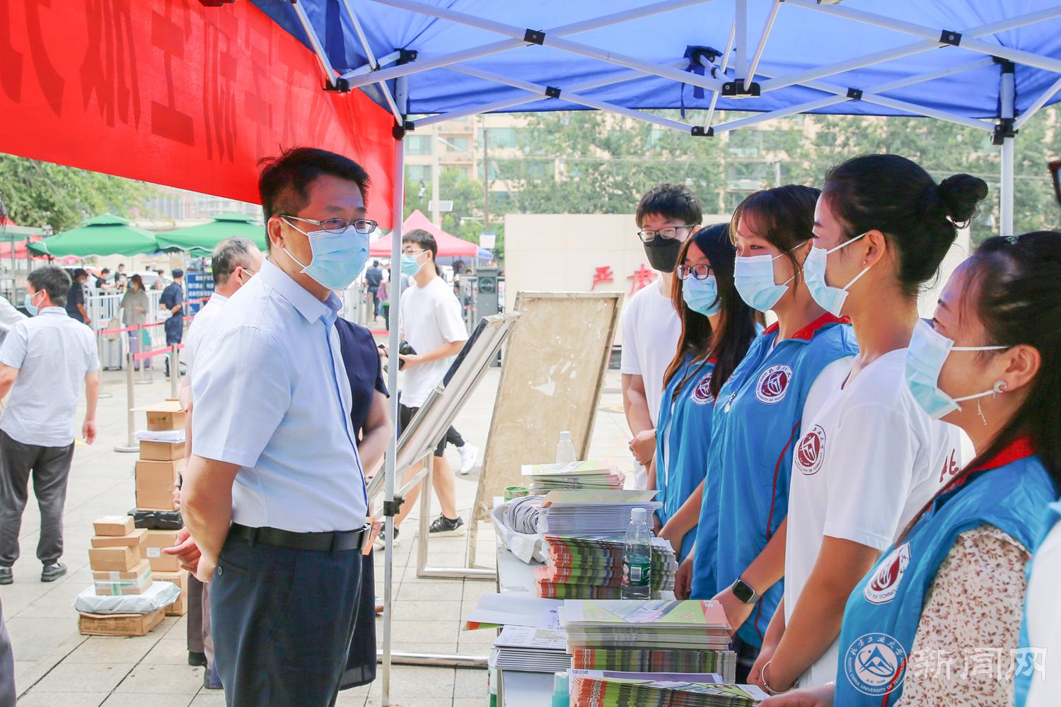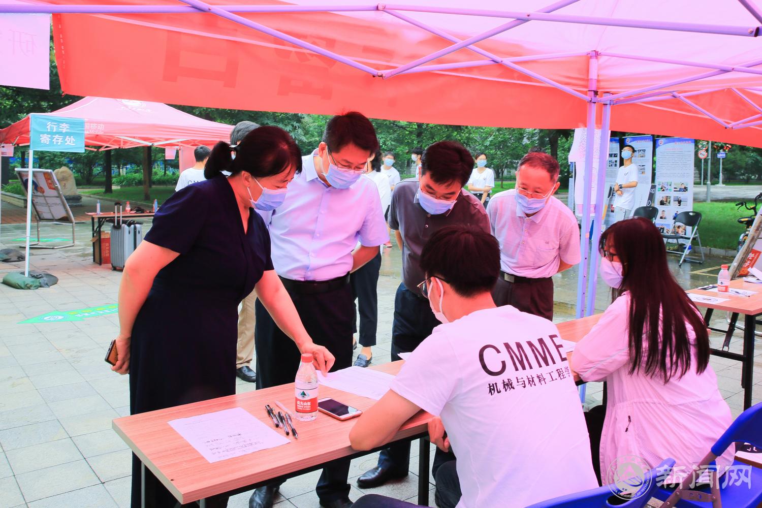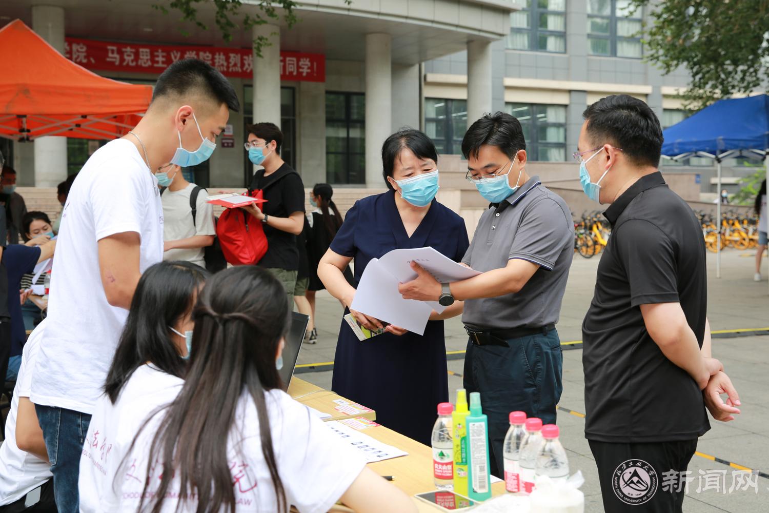在校北门,缪劲翔一行检查了疫情检测和校园安全情况,详细了解了北门新生服务站的工作情况,并慰问了学生志愿者。