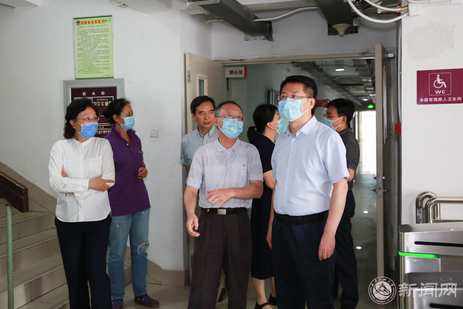 缪劲翔一行来到馨斋公寓,检查了解宿舍迎接新生入住的准备工作,强调要加强宿舍的疫情防控工作和消防安全,保证新生有一个舒适、安全的居住环境。