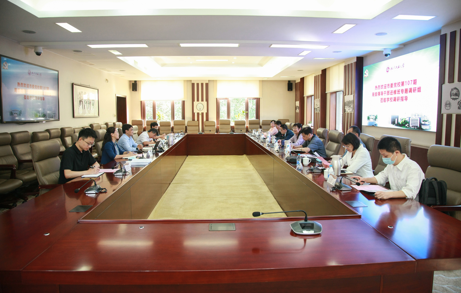 9月27日上午,北京市第107期局级领导干部进修班全面依法治市调研组莅临beat365官网,围绕“坚持法治思维高质量推动首都纪检监察工作”专题调研学校纪检监察工作。调研组由市纪委市监委第十六审查调查室主任吴斌等八人组成,beat365官网党委常委、纪委书记马春成以及学校专职纪检监察干部参加调研。调研开始前,校党委书记缪劲翔会见了调研组一行,对调研组来校调研指导工作表示欢迎。
