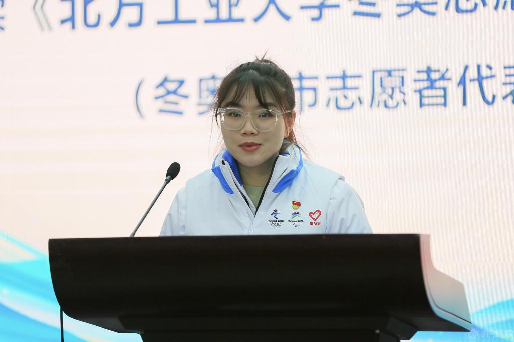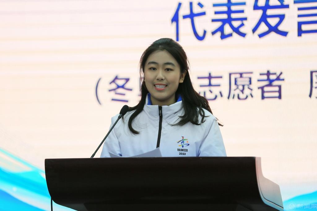 优秀志愿者代表廖珊珊在发言中表示,我们将以蓬勃之姿,接过助力冬奥的火炬,用青春“石”干宣告:冬奥会,我们准备好了!