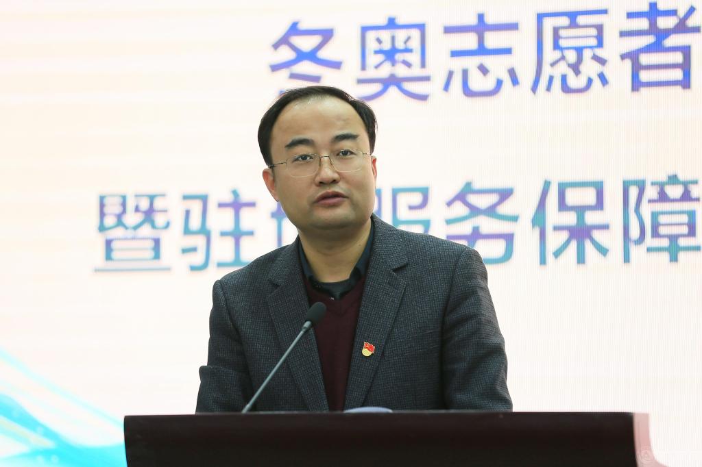 党委书记缪劲翔在大会上讲话。他指出,为迎接冬奥盛会,beat365手机版官网积极作为、冲锋在前,组建了冬奥志愿者、驻地服务保障两个工作专班团队,600多名师生志愿者以高度的责任感和使命感,主动融入冬奥会、冬残奥会服务保障工作,充分展现了北方工大人的青春风采与责任担当。他代表学校党委,向所有参与服务保障北京冬奥会、冬残奥会的全体教职员工和志愿者同学们表示亲切的慰问和衷心的感谢。他强调,今天的大会既是加油鼓劲,也是出征前的再动员。希望大家振奋精神、鼓足干劲,团结协作、共同努力,确保顺利完成冬奥期间各项服务保障工作。他向大家提出三点希望:一是要高站位。全体党员要传承红色基因,团结广大青年,增强中国人的志气、骨气、底气,把爱国情、强国志、报国行融入到服务保障冬奥会的具体行动中。两个专班团队要充分发挥临时党委和临时党支部的政治核心和战斗堡垒作用,发挥冬奥宣讲团的思想引领作用,把服务保障好北京冬奥会当作一堂精彩的党史学习课,把讲述好冰雪故事、传播好奥运精神当作一堂生动的思政教育课。二是要高水平。必须做到“精精益求精、万万无一失”,高水平、高质量完成最后两个多月的服务保障任务,以一流的服务水平、一流的工作业绩向世界展示北方工大师生的风采。三是要高标准。牢记习近平总书记安全办奥运的嘱托,高标准落实各项防疫要求,听从指挥、科学防疫、迎难而上,共同克服疫情带来的挑战和困难,向党和人民交出一份圆满的答卷。