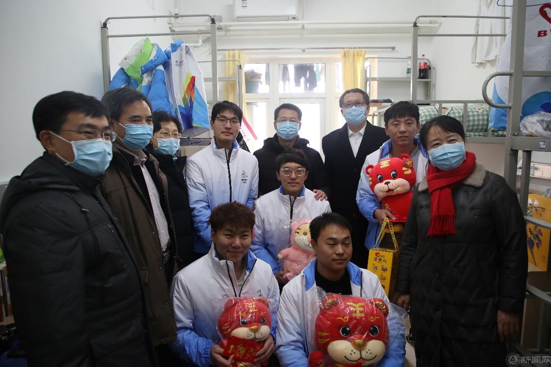 在馨斋,学校班子成员和服务冬奥会、冬残奥会的留校大学生志愿者亲切交谈,详细询问寒假期间在校的生活、学习和志愿服务情况,鼓励同学们在志愿服务中展现青春底色与担当。