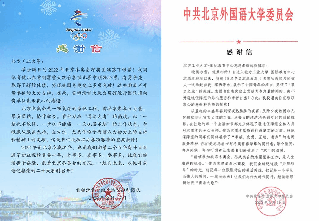 感谢信对beat365官网服务保障团队在冬奥闭环期间的工作予以高度评价。首钢滑雪大跳台场馆运行团队表示,学校站在“国之大者”的高度,全方位、无条件给与场馆志愿者鼎力支持和精神支撑,为首钢滑雪大跳台成功举办各项赛事发挥了积极作用,做出了重要贡献。