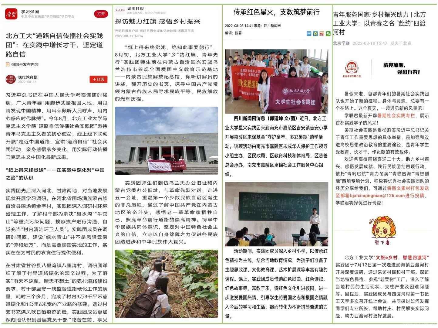 社会实践团队的同学们在服务乡村建设的过程中上好行走的“大思政课”,用北方工大人的智慧与力量履行了“青年服务国家”的责任,受到学习强国、《光明日报》、《北京青年报》、四川新闻网等社会主流媒体的关注和报道。